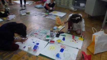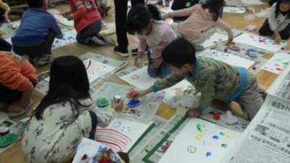 身のまわりのいろいろなものに絵の具をつけて,かたちをうつしています。「顔に見えるよ。」「つづけてうつしたら,お花になったよ。」とうれしそうに話しながら活動していました。