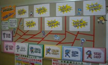 保健室の前には,「かぜをよぼうするために」をテーマにした掲示物があります。休み時間には,子どもたちが楽しそうに見ています。