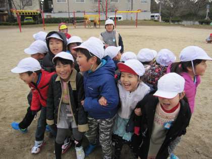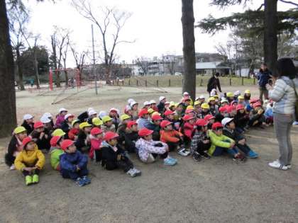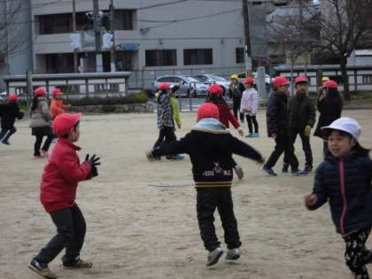 生活科の学習で,二条公園に行きました。教室で,秋の様子を思い出して,冬の公園はどうだろうと学校を出発しました。公園内を友達といっしょにまわって,たくさんの「冬」を発見しました。そのあと,寒い冬にできる遊びを考えて,おにごっこやおしくらまんじゅうをして楽しみました。