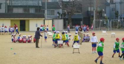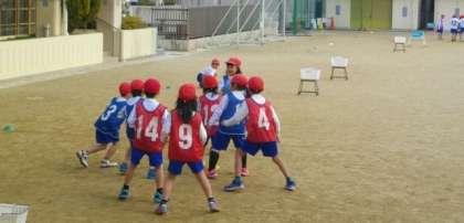1年生が運動場で体育をしています。