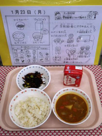 1月の給食目標は「学校給食について知ろう」です。学校給食には,野菜を育てる人,パンをやく人,ごはんをたく人,材料を運ぶ人,献立を考える人,給食をつくる人,給食当番の人など,たくさんの人たちがかかわっています。たくさんの人たちに感謝をして食べてほしいと思います。