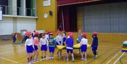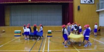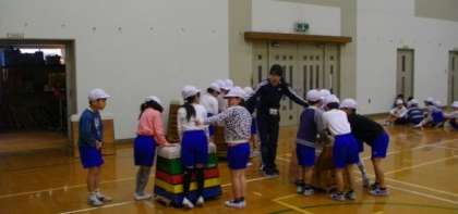 2年生が体育館で跳び箱を使って学習をしています。みんなで協力して,準備に取り組んでます。