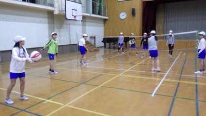 6年1組が体育館でソフトバレーボールをしています。いろいろなチームとのゲームを楽しんだり,グループでパスをまわす練習をしたりしています。