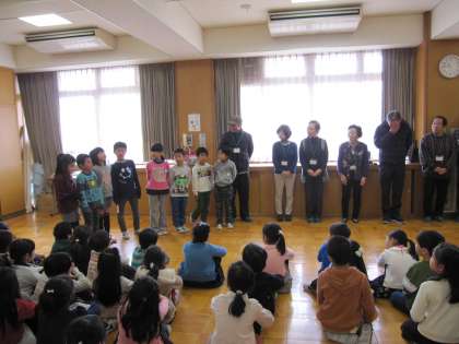 生活科の学習で「昔遊び」に取り組みました。コマ回しやメンコなどを地域の方と一緒に楽しみ,素敵な時間をすごすことができました。また待賢幼稚園の年長さんたちと活動したことも心に残りました。