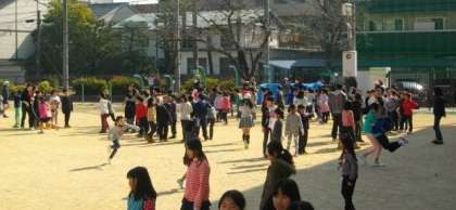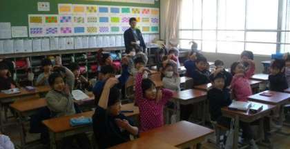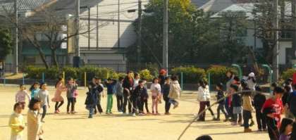 昼休みには運動場でたくさんのお友達が縄跳びをしています。掃除がはやく終わったクラスは,学習を始める前に先生が前に立ってまねっこミニゲームをしていました。