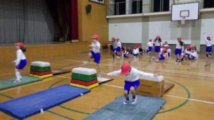 体育館でとび箱の学習をしています。いろいろなとびこし方に挑戦しています。
