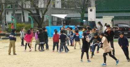 6年生は,なわとびにチャレンジしています。2年生は,ドッジボールを楽しんでいます。4年生はハンドベースボールをしています。雨上がりの運動場で,元気いっぱい遊んでいます。