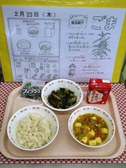 「ほうれんそうとはくさいのごまにと,わふうカレーどうふがおいしかったです。わふうカレーどうふがおいしかったりゆうは,さいしょはあまかったけど,あとから,からくなったのでおいしかったです。」(2年児童)