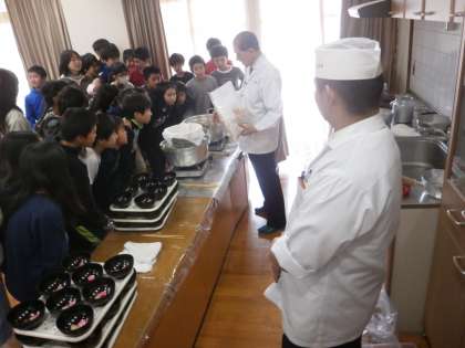 6年生が,地域のお店の萬亀楼さんにお世話になって,だしについて学習しました。実際にだしをとっているところを見せていただきました。また淀大根を水炊きしたものとだしで炊いたものを食べ比べをして感想を発表しました。最後に吸い物椀を試食させていただきました。子どもたちは,おだしの味を味わってたくさんの感想を伝えていました。