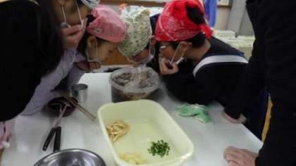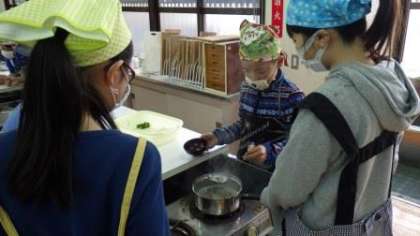 みそ汁の調理実習をしています。味噌は,地域で味噌を製造・販売しておられる加藤さんに教えていただきながら,みんなで4月につくった味噌を使っています。