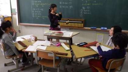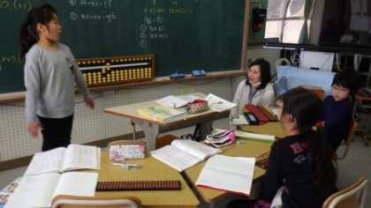 そろばんを使った引き算のしかた(珠の動かし方)について,みんなで発表し合いながら学習しています。