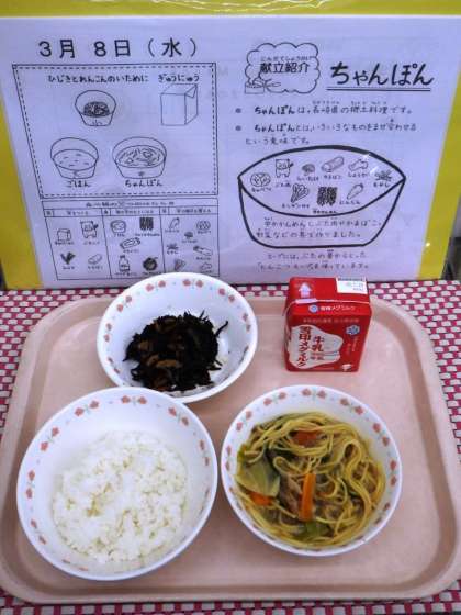 「ちゃんぽんに,いろいろなえいようのあるやさいや肉がはいっていてとてもおいしかったです。」(3年児童)