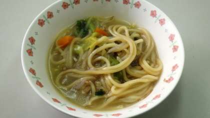 ちゃんぽんは,長崎の郷土料理です。「ちゃんぽん」とは,いろいろなものをまぜ合わせるという意味です。中華めんとぶた肉やかまぼこ,野菜などの具で作りました。スープには,ぶたの骨からとった「とんこつスープ」を使っています。