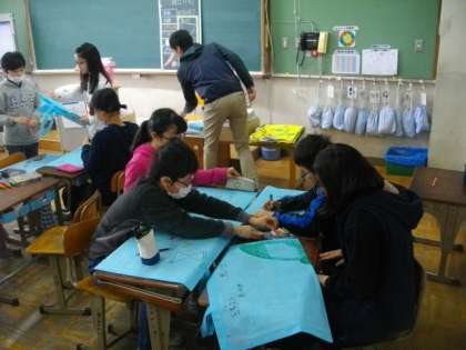5年生は,1年間の作品や学習の足跡をバッグにいれています。3年生は,1年間を振り返りながら,楽しく学年集会を進めています。