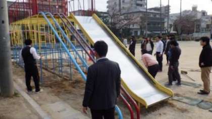 総合遊具の整備をしています。地面の部分を掘ってやわらかくしています。この後,新しいマットを敷く予定です。