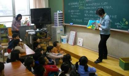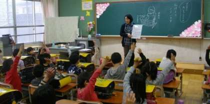 2年生は読み聞かせを静かに聞いています。1年生も元気よく活動しています。
