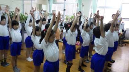 保健室で3年生が発育測定をしています。四肢の検査の練習もしました。