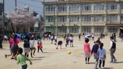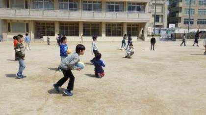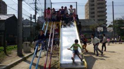 遊具が大人気です。たくさんの子どもたちが外で遊んでいます。