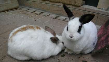 いつもいっしょに仲良く過ごしています。今日はカメラを向けると,恥ずかしそうに「隠れる」うさぎと,「カメラ目線」になるうさぎたちでした。