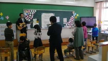 2年生は,学年全体で1年間の学習の見通しとめあてについて学習しています。わかたけ学級は,上京支部の「みんなよろしく大会」に向けて,歌の練習をしています。とても楽しそうです。