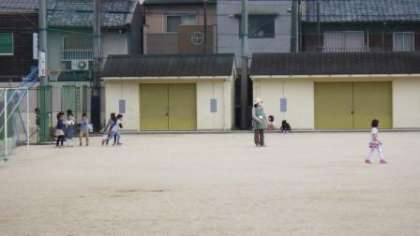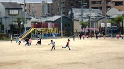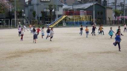 今は,掃除の時間に6年生が1年生の教室の掃除をしています。待っている間に,今日は運動場で遊びました。