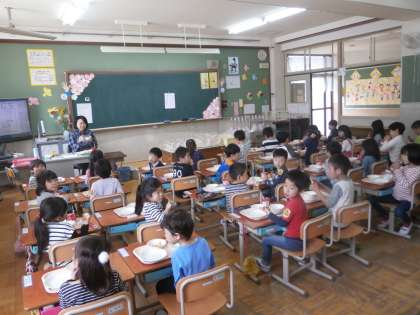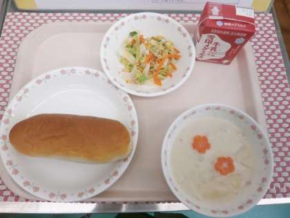 じゃがいものクリームシチューの人参の中には,桜の花型が入っており,子どもたち(特に1年生)は,見つけて喜んで食べている様子でした。1年生も残さいが全くありませんでした。