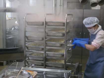 じゃがいものクリームシチューのじゃがいもとツナとキャベツのソテーの人参を,スチームコンベクションオーブンで蒸してから,釜で調理しました。春においしい新じゃがいもや新玉ねぎ,新キャベツを使用したことと,スチコンで蒸してから調理したことで,野菜の甘みやうまみがあっておいしいと好評でした。