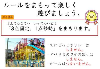 総合遊具も人気があります。教室では,楽しく遊ぶことができるように,総合遊具での遊び方のルールをもう一度確認しました。まずは,「3点固定,1点移動」をまもりながら,楽しくあそんでくださいね。また,春休み中に,地面の土を掘り起こしてやわらかくしました。25日の午前中に,新しい安全マットを敷く予定です。