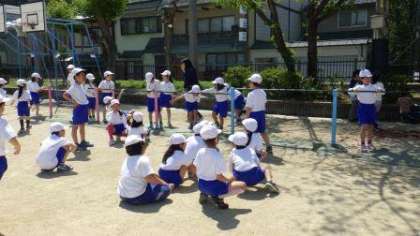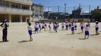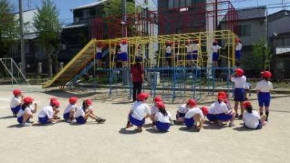 2年1組は,おにごっこをしています。2年2組は鉄棒をしています。2年3組は総合遊具の使い方を学習しています。