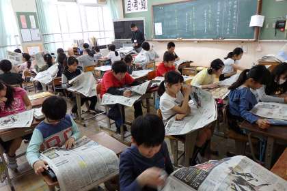 新聞の一面にどのようなことが書かれているか調べたり,同じことが書かれた記事を読み比べたりしていました。