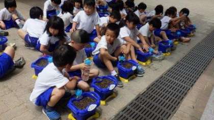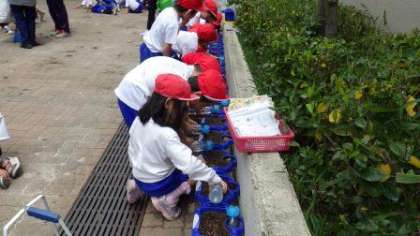 一人一鉢でアサガオの種をまきました。やさしく水やりもしていました。