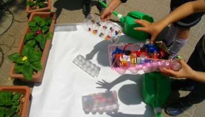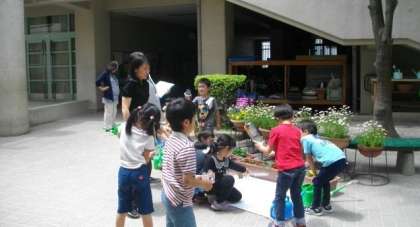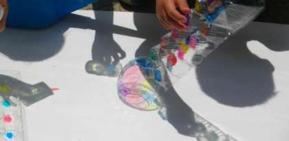 透明プラスチックの容器にセロファンやマジックで色付けをし,太陽の光にかざして,いろいろな影の形や色が浮かび上がる様子を楽しんでいます。映る影を見た後,自分なりの工夫を加えたり,友達の作品と見比べたりしています。