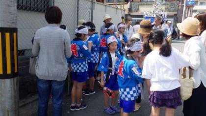 子どもたちが地域のお祭りの子どもみこしに参加しています。校区内の公園で休憩しています。