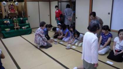 茶道のおけいこが始まりました。今日は,五月人形の前で活動しています。