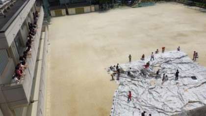 大仏の絵を運動場で広げて,大きさを確かめました。