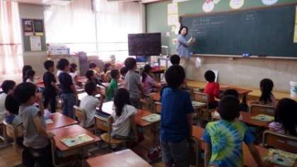 2年生との「がっこうたんけん」についてふり返っています。たくさんの子どもたちが気づいたことや,もっと知りたいことなどについて発表しています。