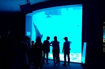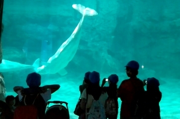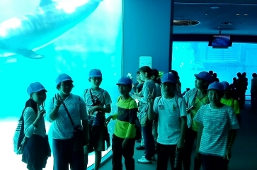 イルカショーが終わりました。再びグループで名古屋港水族館を見学しています。