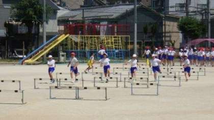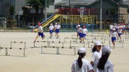 運動場でハードルの学習をしています。