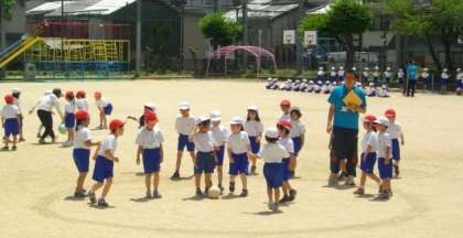 1年生が,運動場で体育をしています。