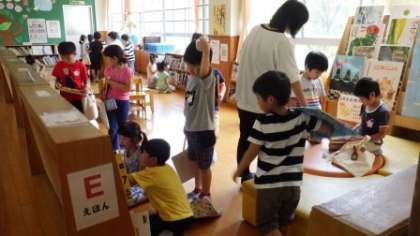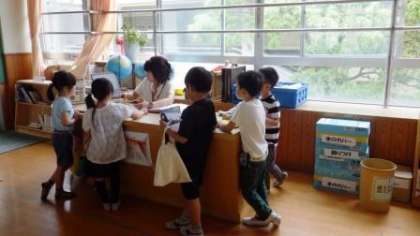 本を選んだり,カウンターに並んで本の貸し借りをしたりしています。