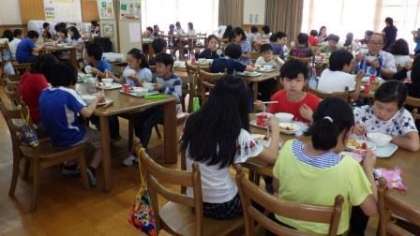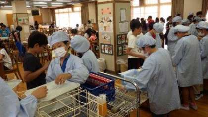 今週は,6年生全員でランチルームで給食を食べています。配膳も手際よくできていました。