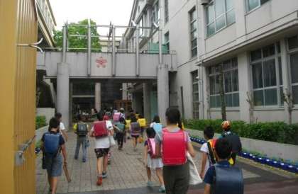 曇り空で,昨日に比べて幾分涼しく感じます。子どもたちが登校してきました。