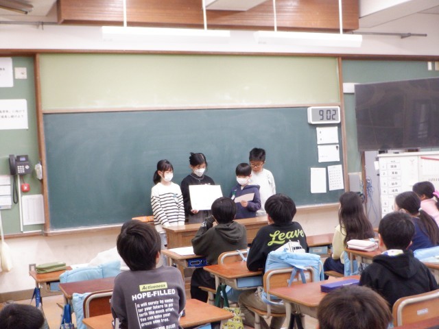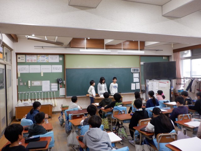 国語科「調べて話そう、生活調査隊」の学習で、生活の中の疑問に関するアンケートを取り、その結果から分かったことや考えたことを発表しました。発表を通して、学級の友達が休みの日にしていることや好きなテレビ番組、お風呂の時間など、普段は知りえないことについて知ることができました。また、グループのメンバーで発表内容の構成や資料作成、役割分担など話し合いながら協力して進めることができました。