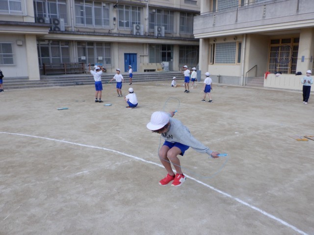 体育科の学習で、なわとびに取り組んでいます。「両足とび」や「交差とび」、「あやとび」などの基本的な技から「二重とび」や「はやぶさ」などの発展技まで、何回続けることができるかに挑戦しています。連続二重とびの世界記録は10709回だそうです。まずは目指せ連続10回!!