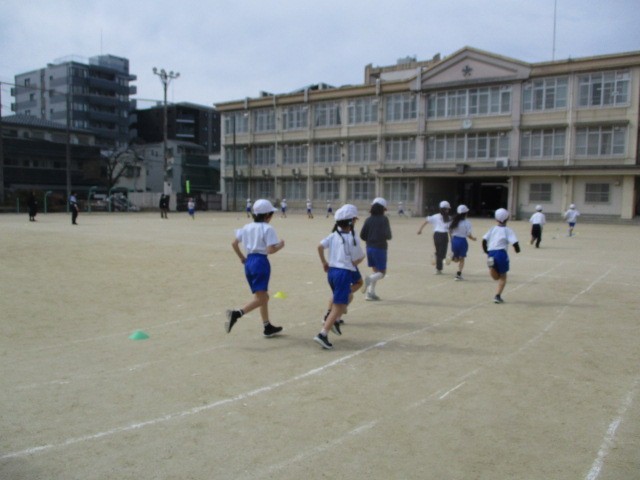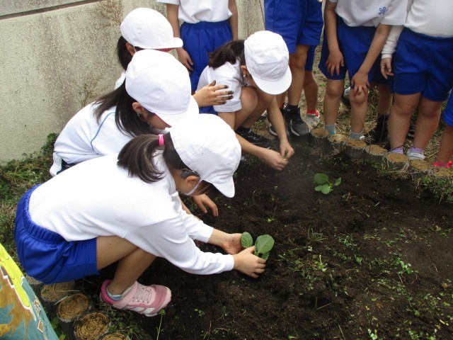 少しずつ暖かくなってきました。今日の体育は「ゆっくりかけあし」です。暖かな日差しのもと、気持ちよくかけあしを楽しみました。クラスごとに走ったのですが、待っている間には、3年生への準備として畑にキャベツの苗を植えました。