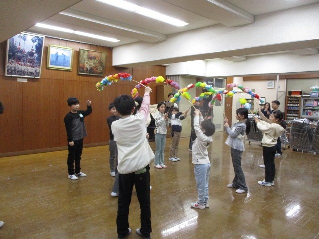 1年生の元気な初めの言葉から始まり、2種類のゲームで楽しみました。最後には6年生からお礼の言葉をもらい、花道を作って見送りました。