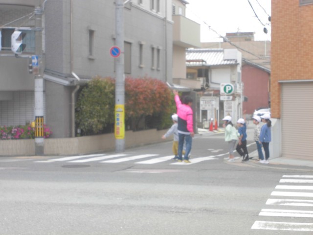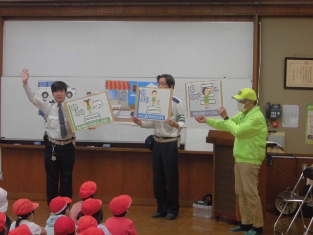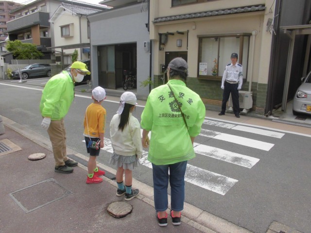 まず、上京警察署の方から、道路を歩くときや横断歩道を渡るときのルールや気をつけることなどの話を聞きました。その後は、出水・待賢交通安全会の方に見守っていただきながら、実際に学校の近くを2人組で歩きました。道々でしっかりと自分で安全確認をしながら歩く姿が頼もしかったです。