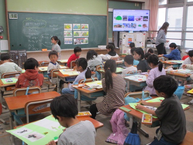 先週から校庭へ出て、春を感じものを探し、絵を描きためてきました。今日は、描きためた絵を色画用紙に貼りました。その周りにも春を感じるものを書きました。みんなどのように表すかを考えながら、描き進めていました。