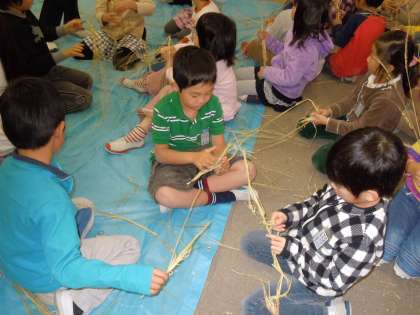 縄らいをしました。穂をとったあとの稲を使って行いました。「稲はほかすところがなく、全部使えるよ。」「わらじやわらぐつなどになるよ。」とを教えてもらいました。