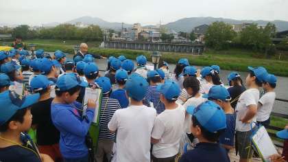 4年生は2学期の総合的な学習の時間でで鴨川をテーマとした「京のシンボル鴨川」の学習を進めています。今日は鴨川の夏の風物詩として有名な「床」を体験しに行きました。料亭「幾松」さんにお世話になり、床から見える鴨川やその向こうに見える東山の風景,鴨川から吹いてくるここちよい風を感じながらおいしい食事を愉しむためにたくさんの人がこられることを教えてもらいました。鴨川は人の心を癒す大切な働きをしていることに気付いていました。